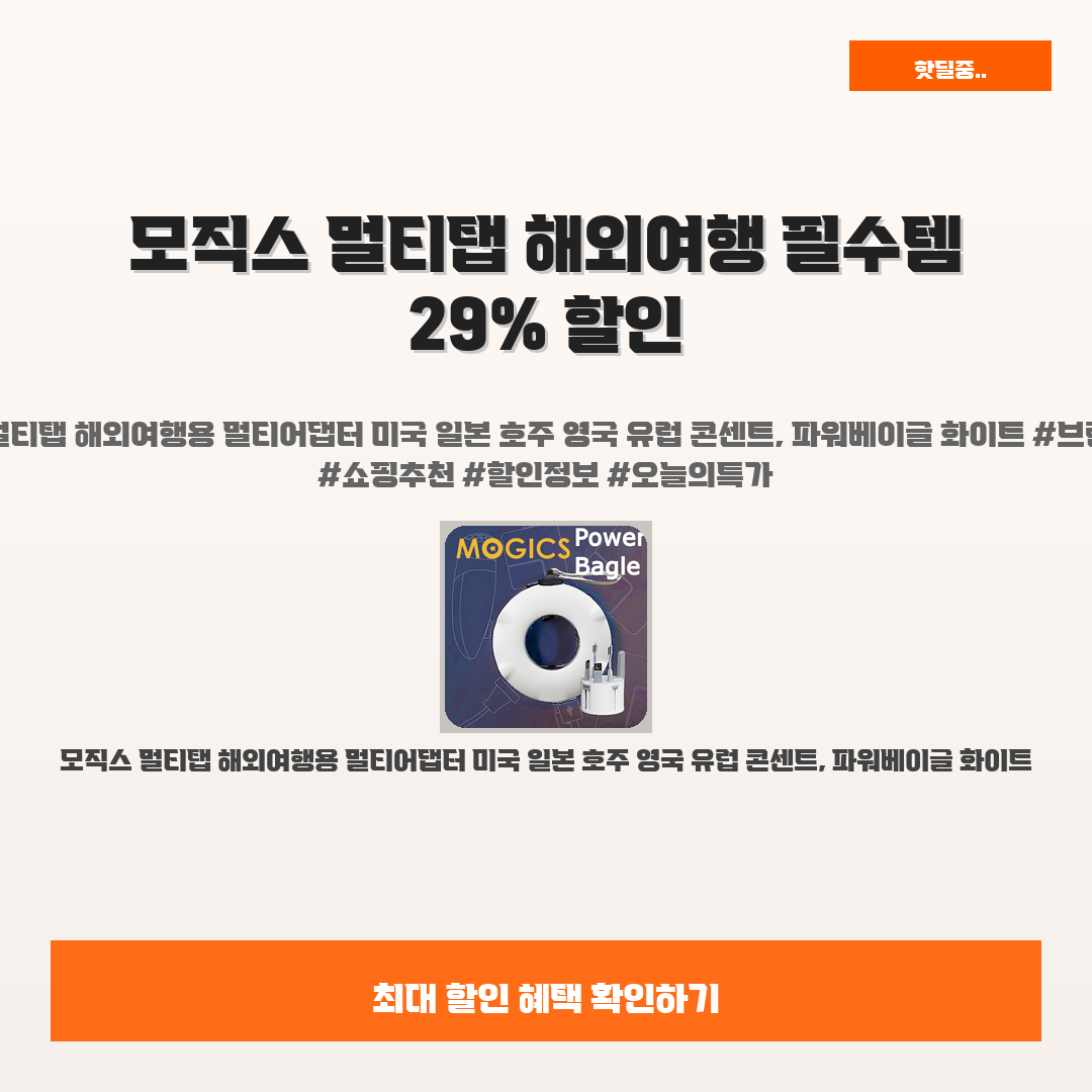 🛍️ 이 포스팅은 네이버 쇼핑 커넥트 활동의 일환으로,판매 발생 시 수수료를 제공받습니다.해외여행 필수템!바로 모직스 멀티탭 해외여행용 멀티어댑터입니다! ✈️여러분, 출국 전마다 콘센트 문제로 고민했던 적 있으시죠? 미국, 일본, 호주, 영국, 유럽까지 다양한 전원 규격 때문에 난감했던 경험이 많으실 거예요. 하지만 이제는 걱정 끝!모직스 멀티탭 하나만 있으면 모든 나라에서 문제없이 충전 가능하니 여행의 스트레스를 줄여보세요. 그리고 지금 그 충격적인 가격, 무려 29% 할인으로 만나볼 수 있습니다! 🌟여행의 시작이 즐거울 수 있도록, 가성비도 뛰어난 이 멀티탭을 놓치지 마세요. 기대 이상의 만족감을 느끼실 거예요! 🎉모직스 멀티탭 해외여행용 멀티어댑터 미국 일본 호주 영국 유럽 콘센트, 파워베이글..