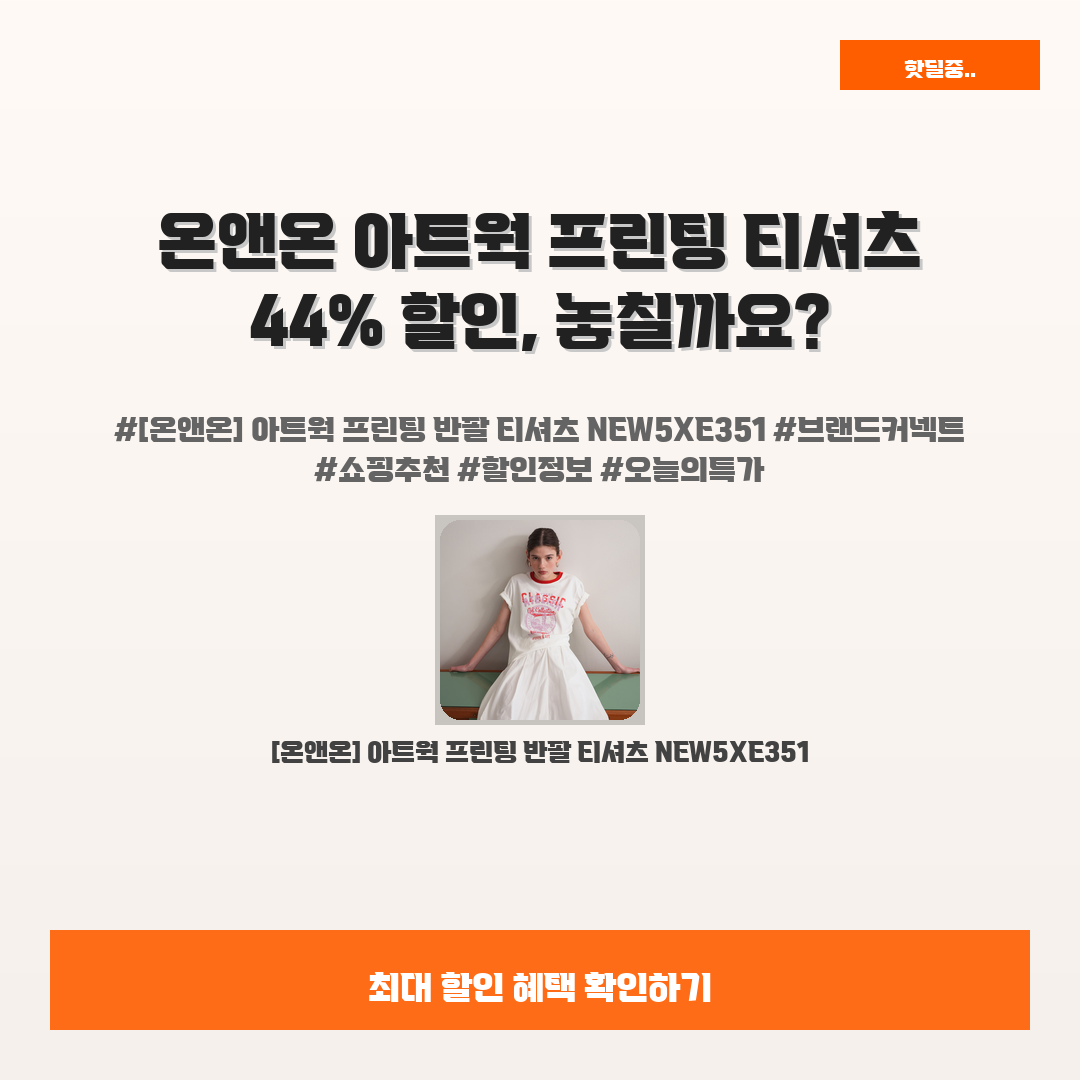 🛍️ 이 포스팅은 네이버 쇼핑 커넥트 활동의 일환으로,판매 발생 시 수수료를 제공받습니다.지금 놓치면 후회할 상품!바로 온앤온 아트웍 프린팅 반팔 티셔츠 NEW5XE351인데요.여름에 입기 딱 좋은 스타일의 티셔츠를 찾고 계신가요?이 티셔츠는 그야말로 완벽한 선택이에요!특별히 준비한 44% 할인으로 오늘만 44,240원에 만나볼 수 있는 기회입니다.한번 입어보면 그 매력에 빠질 거예요 ^^이제는 고민하지 말고 가성비 ! 옷장 속 멋진 아이템으로 추가하세요!고객 후기도 이미 폭발적이에요! 지금 바로 확인해 보세요!※ 이거 진짜 제가 직접 써보고 쓰는 리뷰예요 광고 아님!![온앤온] 아트웍 프린팅 반팔 티셔츠 NEW5XE35144% 79,000원44,240원온앤온 지금 구매하기 → ⭐ 아트웍 프린팅 반팔 ..