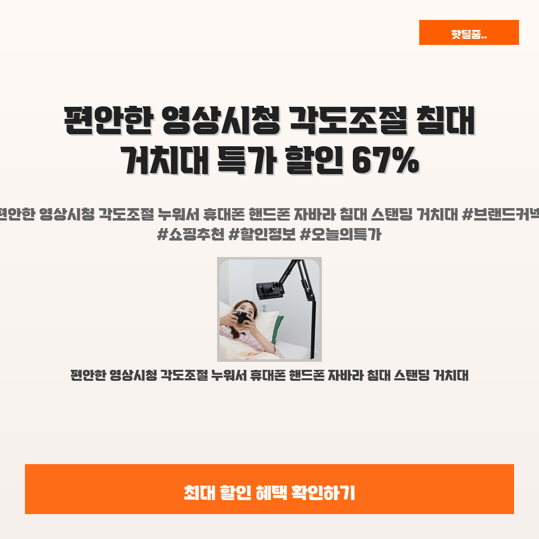 🛍️ 이 포스팅은 네이버 쇼핑 커넥트 활동의 일환으로,판매 발생 시 수수료를 제공받습니다.오늘 소개할 제품은 단언컨데,,정말 필수 아이템이에요! 편안한 영상시청 각도조절 누워서 휴대폰 핸드폰 자바라 침대 스탠딩 거치대가 여러분의 삶을 한층 더 업그레이드 시켜줄 거란 말씀드려요.하루 종일 누워서 좋아하는 영화를 즐기고 싶지만, 불편한 자세 때문에 골치 아프신가요? 저도 그랬거든요… 하지만 이 거치대 덕분에 이제는 편하고 아늑하게 영상시청을 즐길 수 있게 되었답니다!여러분도 이 편안함을 꼭 경험해 보셨으면 좋겠어요. 진짜로 후회 없는 선택이 될 거예요. 가격도 너무 착한데다, 지금 놀라운 67% 할인을 통해 여러분께 제공된다고 하니 뛰어오르지 않을 이유가 없죠!※ 이거 진짜 제가 직접 써보고 쓰는 리뷰예요..